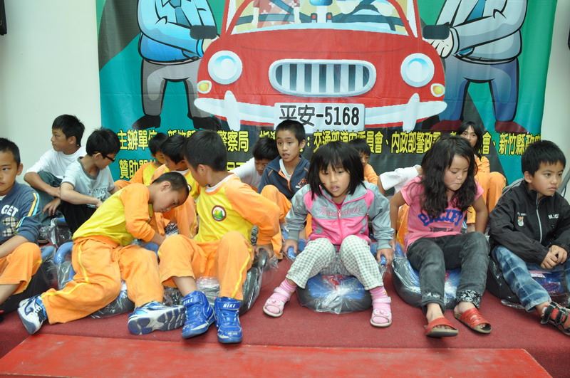 受捐贈的尖石新光國小19位小朋友,為了趕上記者會,早上4點就起床,他們在即將卸任校長陳智明與新任校長高文良陪同下,到位於新竹縣婦幼館地下室的交通隊,在邱縣長及交通隊職員示範下,戶外教學上了一堂交通安全課程。