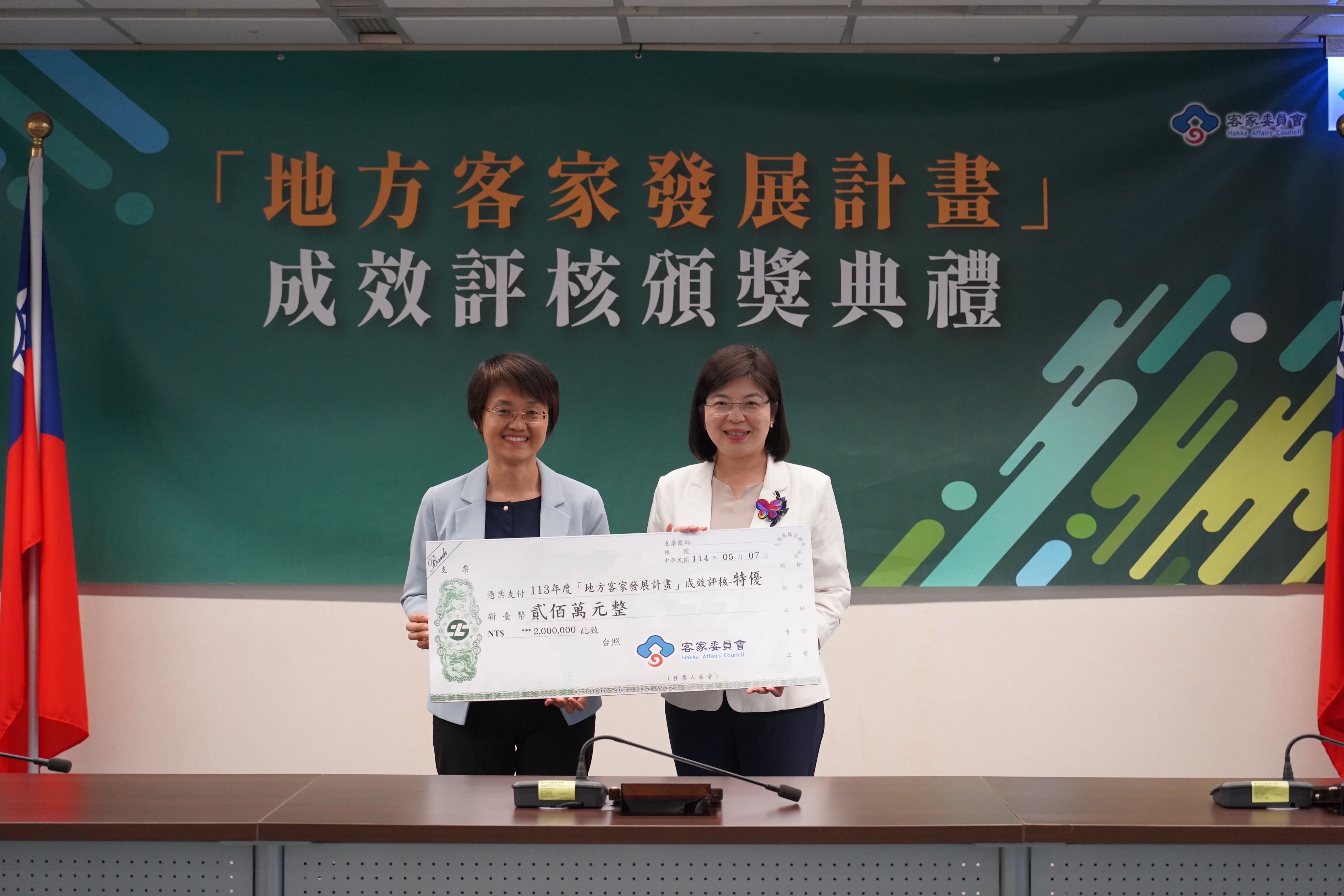 客家委員會舉辦「113年度地方客家發展計畫」評核,新竹縣在全國眾多參與縣市中脫穎而出,勇奪全國唯一「特優」的肯定,縣府秘書長李安妤今(7)日代表縣長楊文科北上客委會接受主委古秀妃頒發獎牌與最高獎勵金200萬元。李安妤表示,112年新竹縣在地方客家發展計畫就獲得全國特優,這次再度蟬連,要感謝客委會的大力支持及縣府團隊、各鄉鎮市公所同仁的努力,新竹縣將持續深化文化內涵,打造充滿活力與人文底蘊的客庄生活環境。