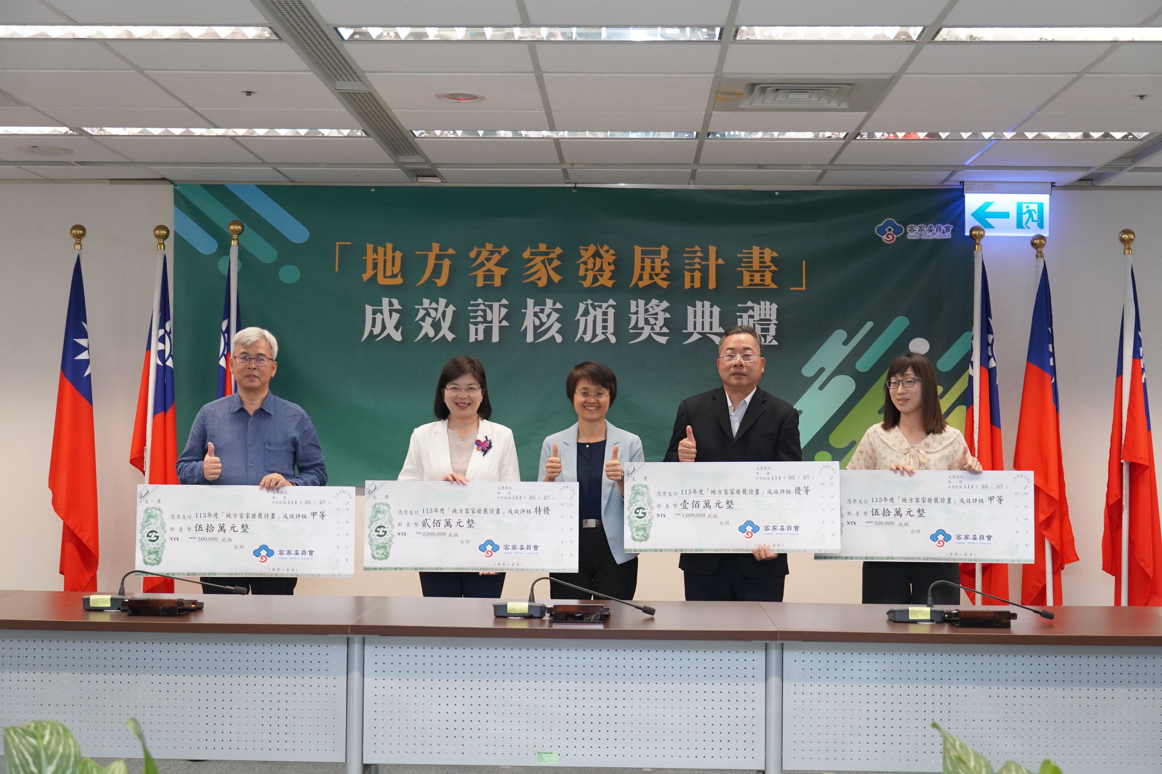 客委會指出,113年共有14個直轄市、縣(市)參與地方客家發展計畫評核,評核結果,新竹縣政府獲得特優與獎金200萬元、苗栗縣政府獲得優等與獎金100萬元、屏東縣政府及宜蘭縣政府獲得甲等與50萬元獎金。