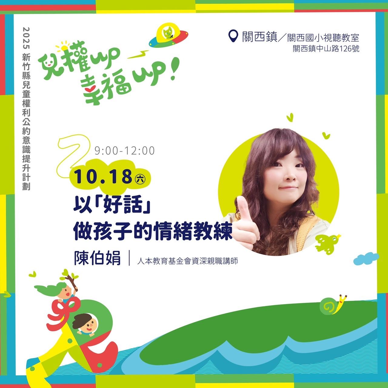 第二場講座於10月18日上午9時至中午12時,在關西國小視聽教室舉辦,主題為「以好話做孩子的情緒教練」,邀請人本教育基金會陳伯娟資深親職講師。