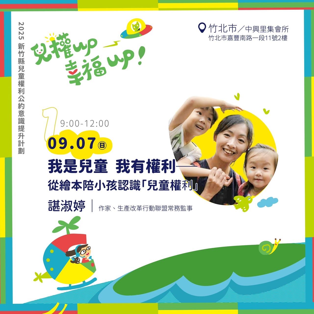 新竹縣兒童權利公約家長講座共有4場,第一場講座於9月7日上午9時至中午12時,在竹北市中興里集會所辦理,邀請作家兼生產改革行動聯盟常務監事諶淑婷講師,主題是「我是孩子我有權利-從繪本陪小孩認識兒童權利」。