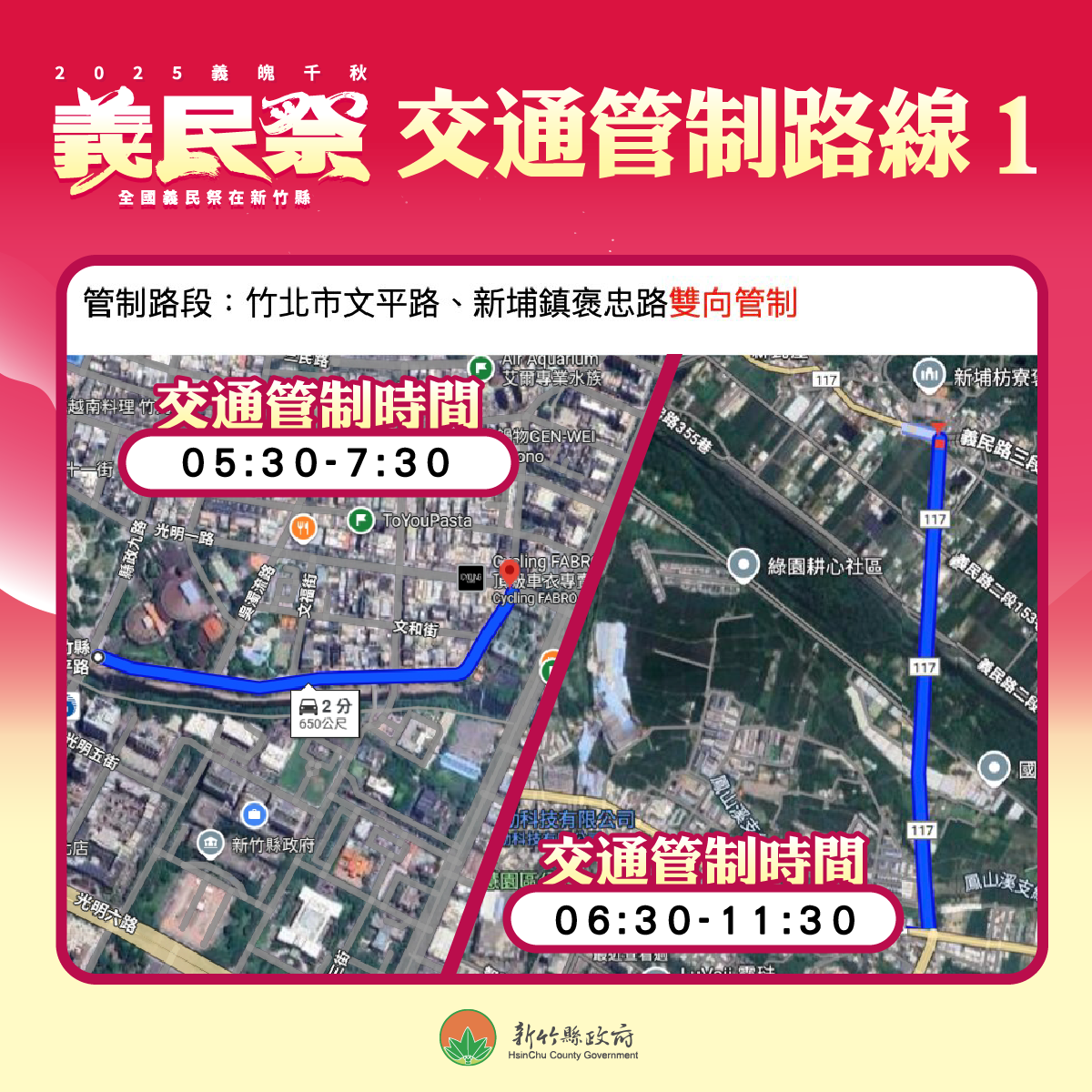 2025「文化30.義民勇士路跑」將於9月6日在新竹縣政府文化局前正式起跑。活動分為義民組以及勇士組,路線如下: