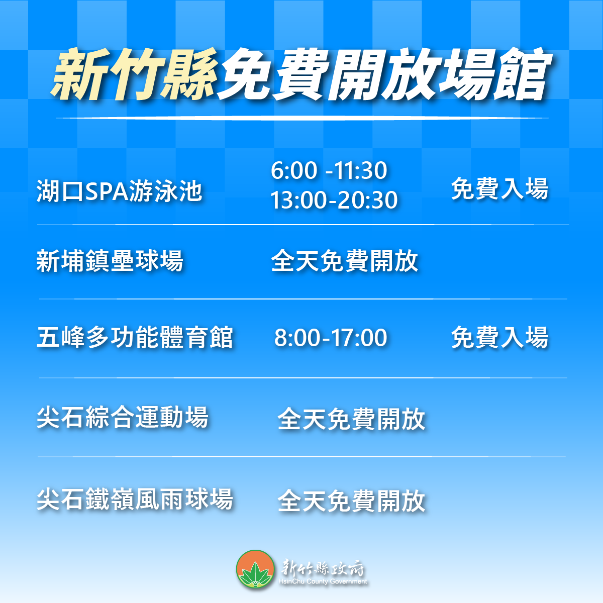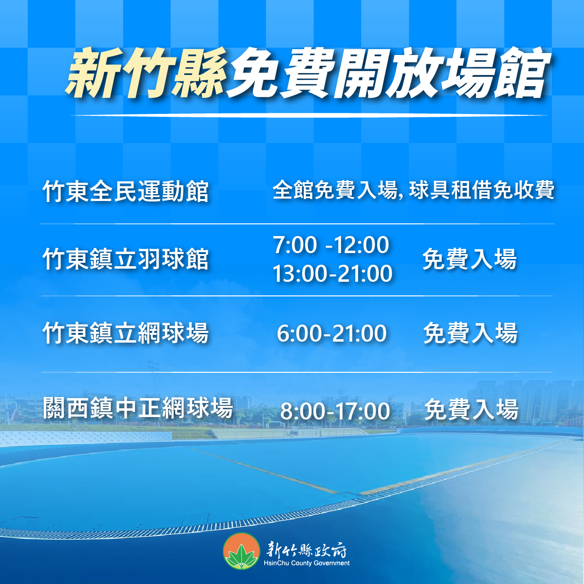 新竹縣「九九國民體育日」免費運動場館資訊如下: