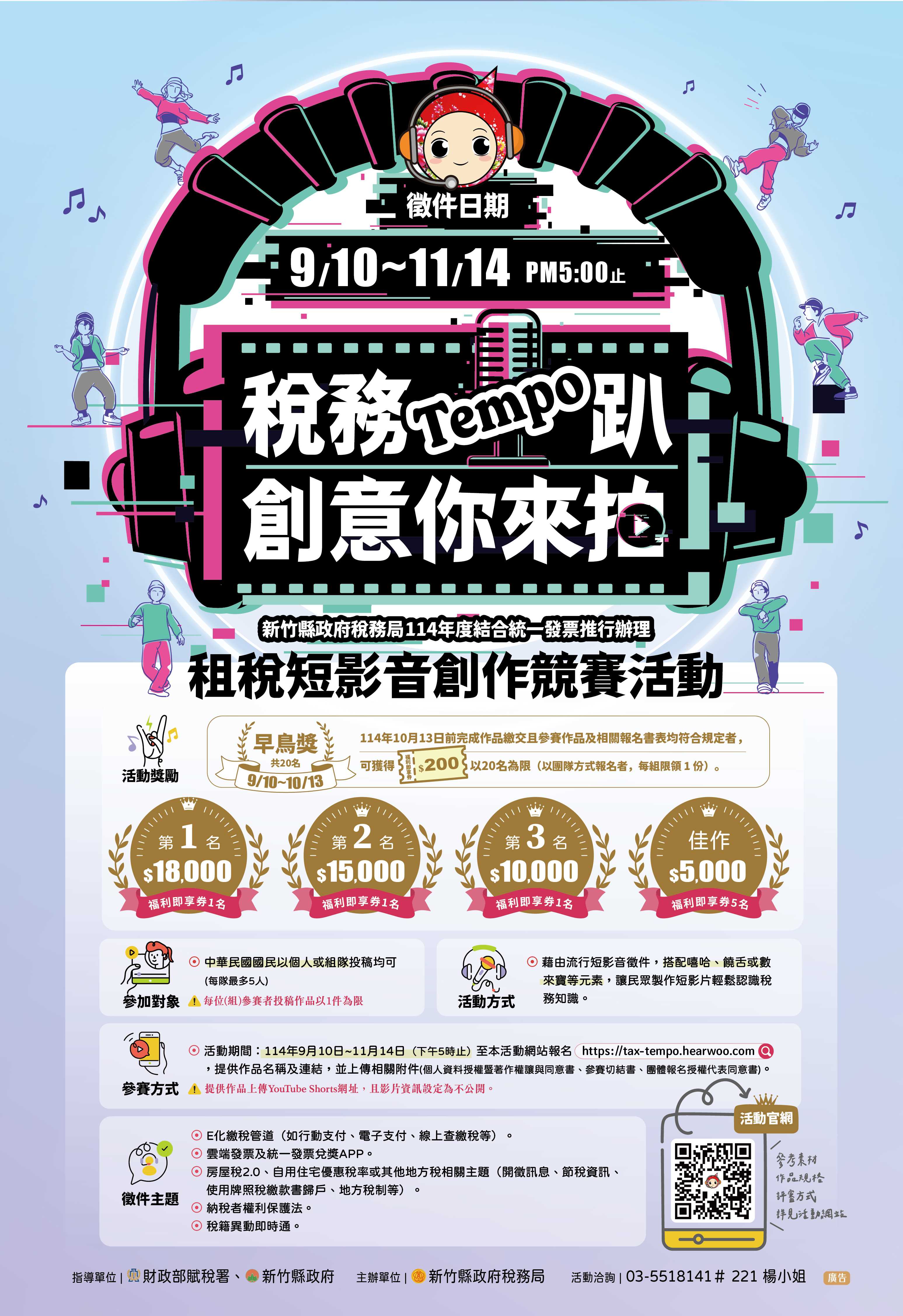 為推廣租稅知識與雲端發票,新竹縣政府稅務局結合時下最受歡迎的短影音創作,推出「稅務Tempo趴 創意你來拍」租稅短影音創作競賽,號召全民以嘻哈、饒舌或數來寶等元素,將生硬的稅務知識變得有趣又有節奏感!