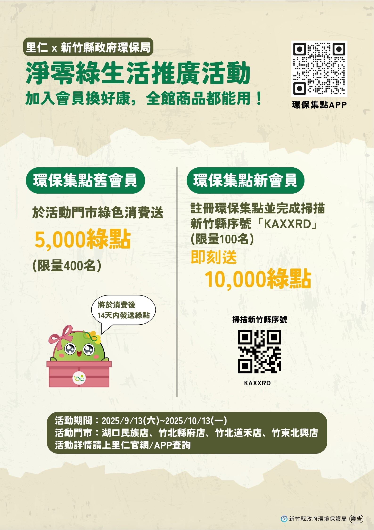 環保局並說明和里仁在竹縣的4家綠色商店(湖口民族店、竹北縣府店、竹北道禾店及竹東北興店)合作,從即日起到10月13日止推出綠色消費送5000綠點(限400名)、以及新註冊環保集點會員贈1萬綠點(限量100名)的活動,1000綠點採購里仁綠色商品可折10 元現金。