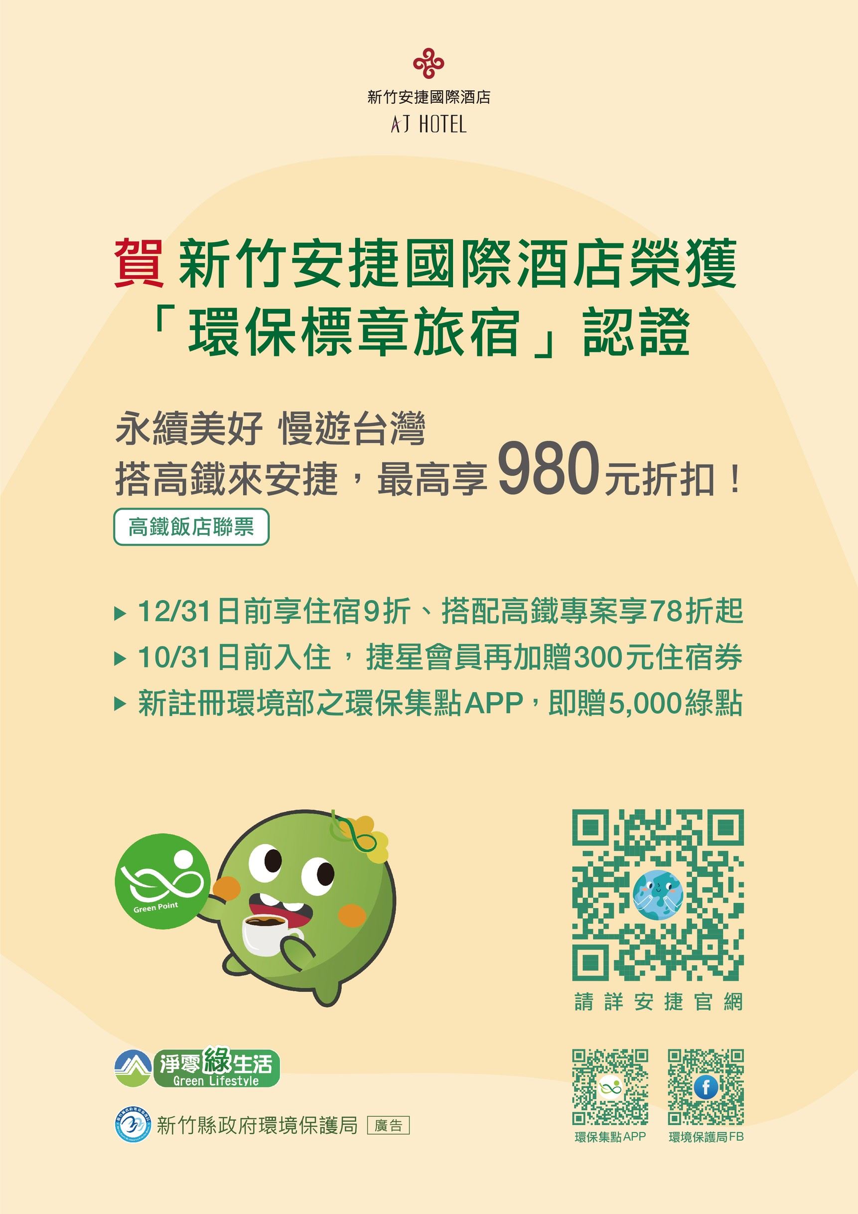 另外,環保局與新竹安捷國際酒店(AJ HOTEL)合作,鼓勵民眾「搭高鐵、住綠旅」。即日起至10月31日,凡搭乘高鐵入住酒店並註冊環保集點APP,即享週日房價9折優惠,另加贈住宿抵用券與綠點。高鐵票同享78折起優惠,實踐「交通+住宿」一次到位的低碳旅遊,讓永續生活兼顧省錢與便利。