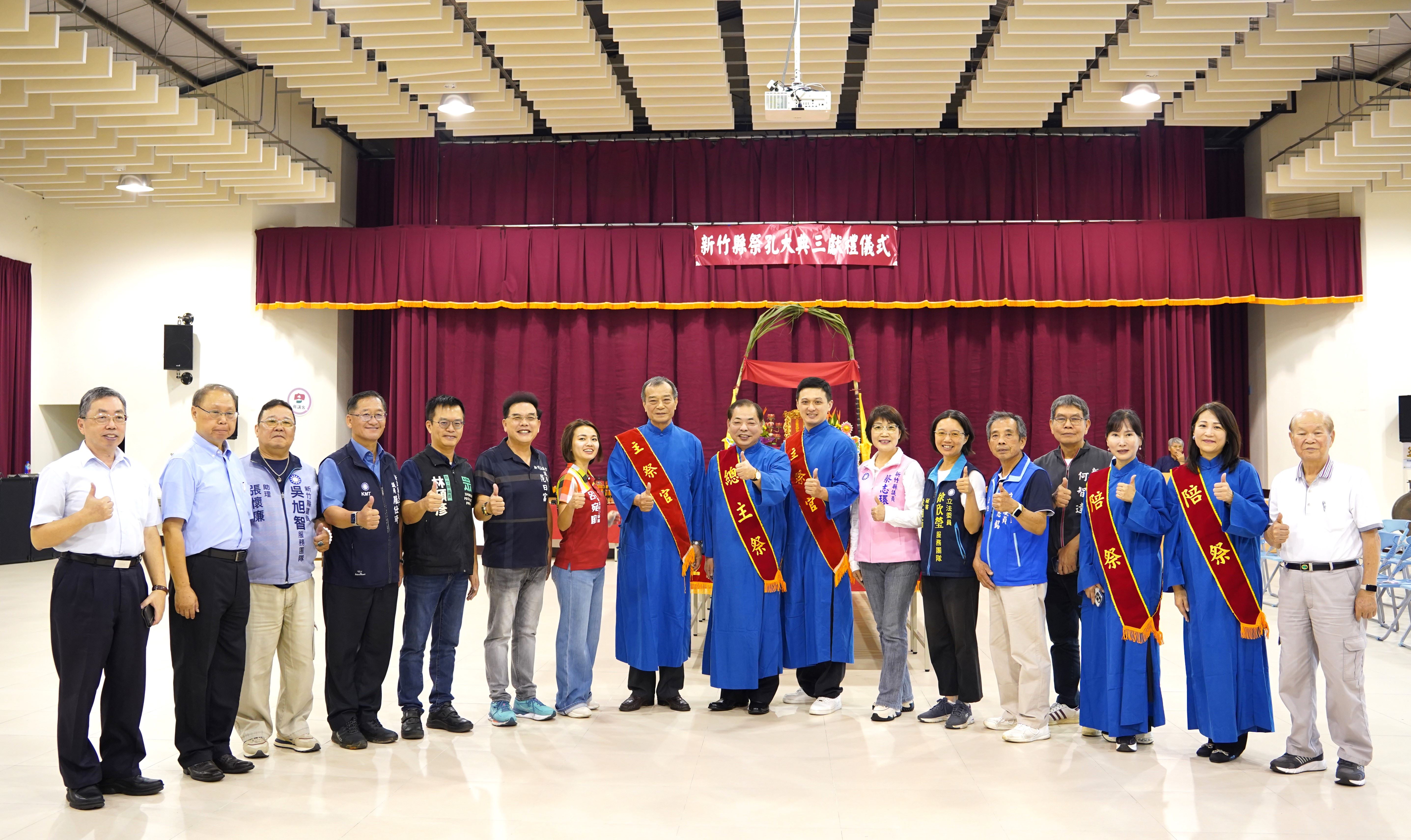 新竹縣114年祭孔大典三獻禮儀式於今(26)日上午10時在新埔鎮公所大禮堂舉行,典禮由副縣長陳見賢擔任總主祭官、新埔鎮長陳英樓、新埔鎮民代表會主席王繼緯擔任主祭官,縣府民政處長陳建淳、教育局長楊郡慈及新竹縣議會各議員擔任陪祭官,在客家八音的悠揚樂聲中,遵循客家傳統祭祀三獻禮儀式進行,場面莊嚴隆重。