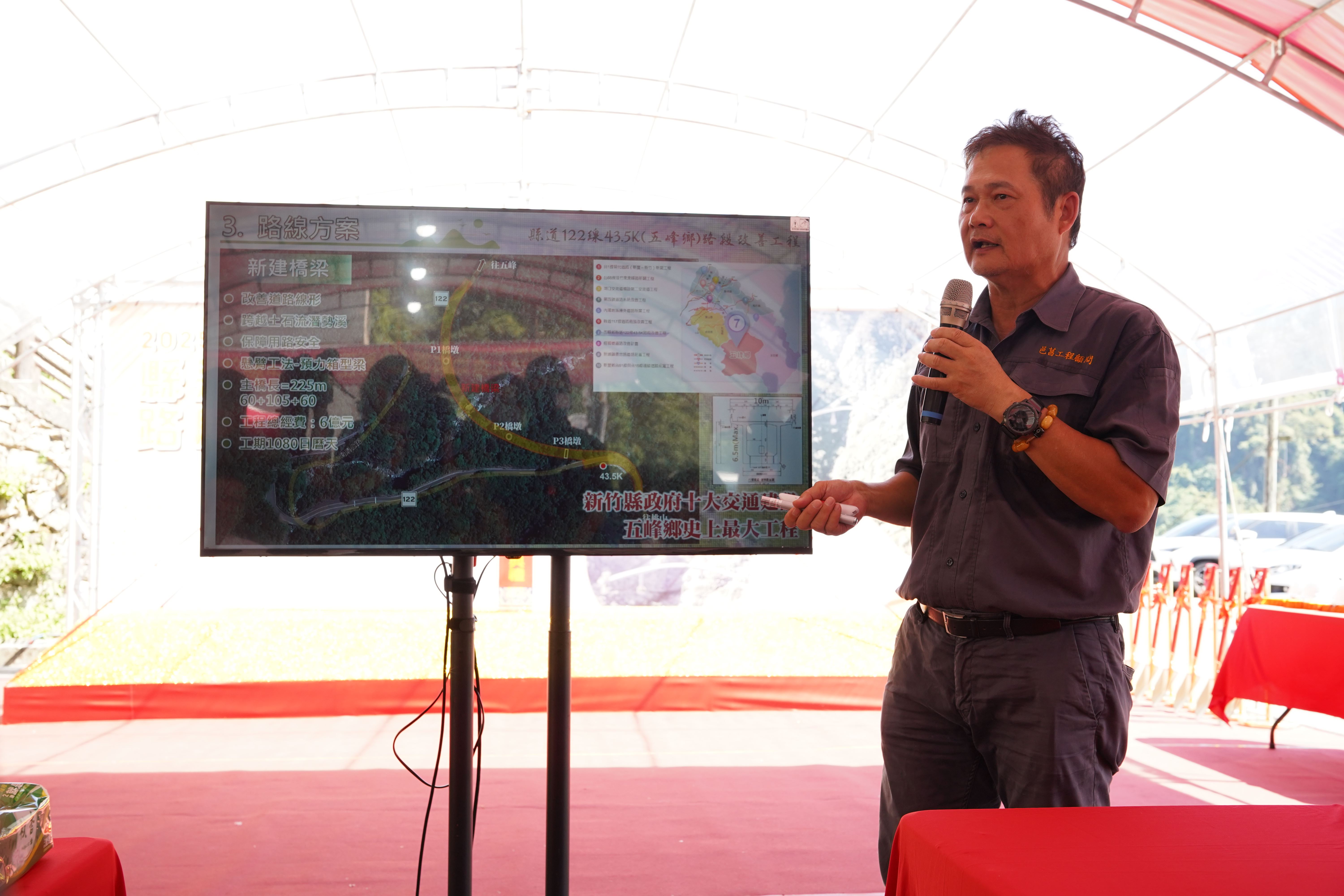 工務處長戴志君表示,縣道122線在43.5K附近路段原本線形不佳,彎道半徑過小,屬重複致災區域,每遇颱風豪雨常有土石崩落導致交通中斷的情形,工程將於縣道122線43.5K處增設跨越坑溝的新橋,使得道路遠離土石流潛勢溪威脅,工期為1080日曆天,預計於116年底完工通車。