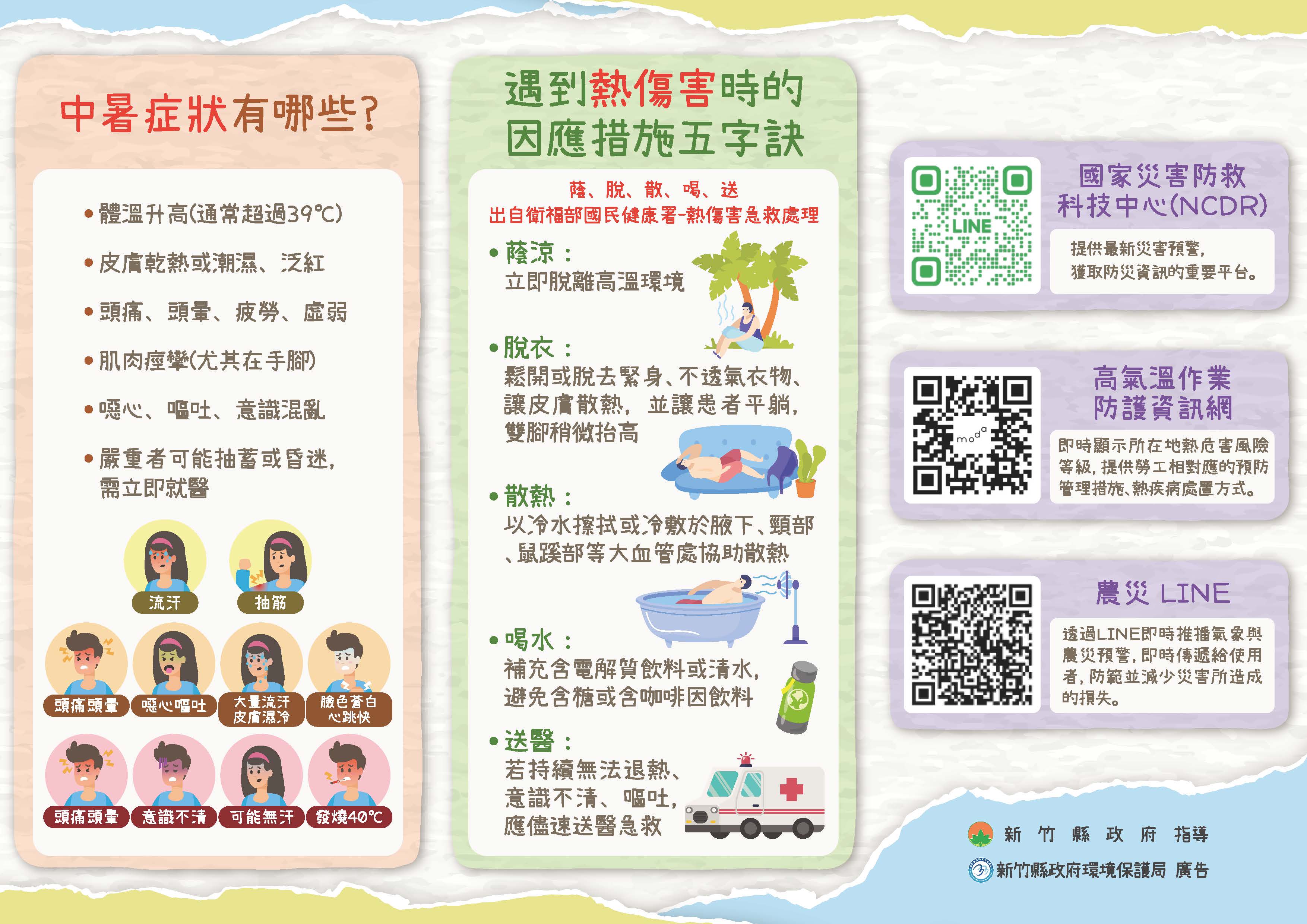 環保局表示,氣候變遷下,極端高溫已成新常態,提醒民眾牢記「多喝水、多休息、要遮陽」三大口訣。預防熱傷害的關鍵在於補充水分、避免長時間曝曬、穿著透氣衣物,並隨時注意身體狀況,若出現頭暈、心悸、冒冷汗或肌肉抽筋等症狀,應立即停止作業、移至陰涼處休息並補充水分,必要時立刻撥打 119 求助。