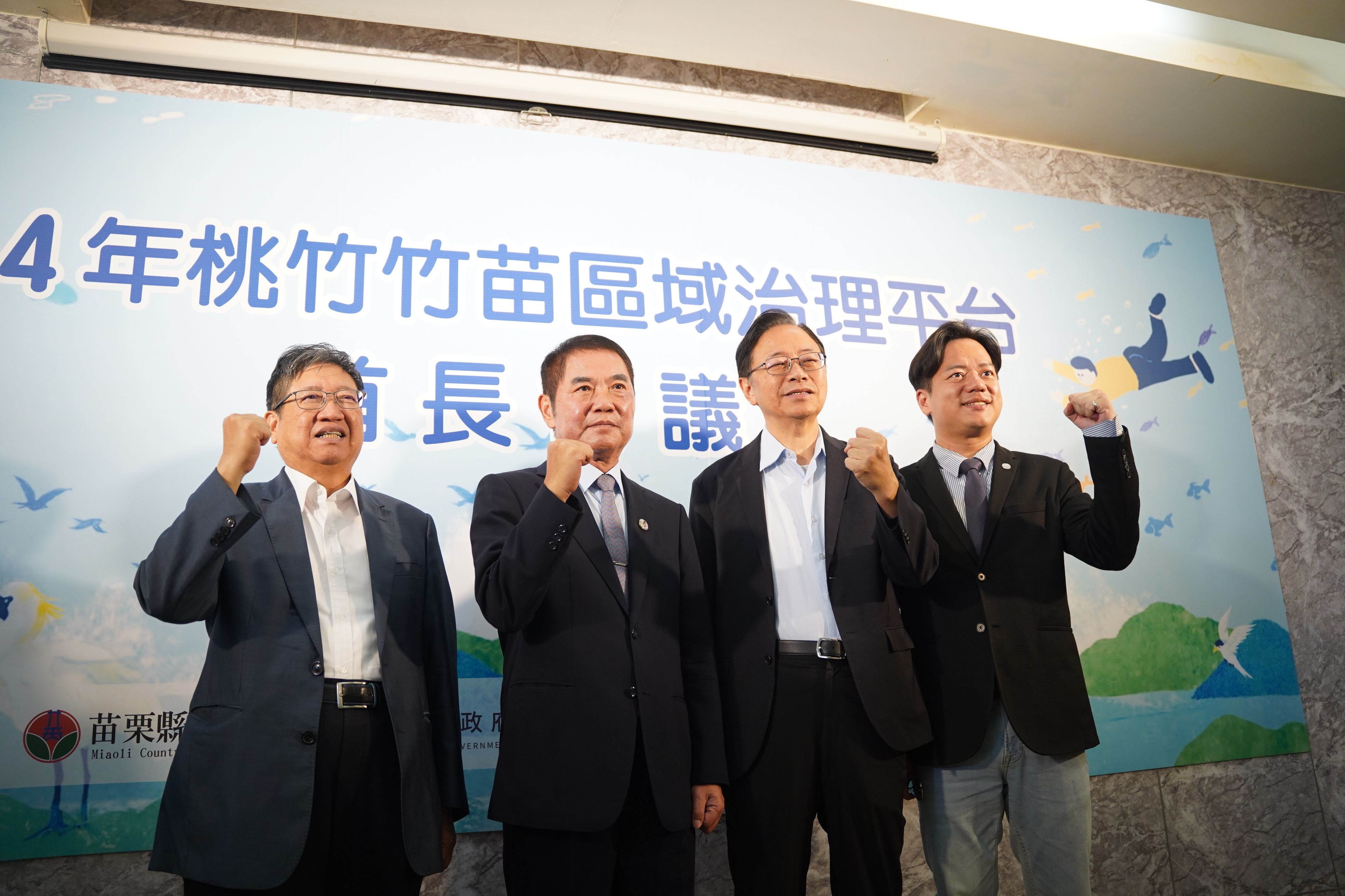 114 年「桃竹竹苗區域治理平台」首長會議今天(10月9日)在苗栗縣頭屋鄉水漾月明會館會議廳舉行,新竹縣縣長楊文科偕同桃園市市長張善政、新竹市代理市長邱臣遠及苗栗縣縣長鍾東錦共同出席。該平台成立至今已邁入第 10 年,四縣市首長在會議中表達對於桃竹苗大矽谷計劃的憂心,並由各縣市提出15項新增合作案,共同追求區域共榮。