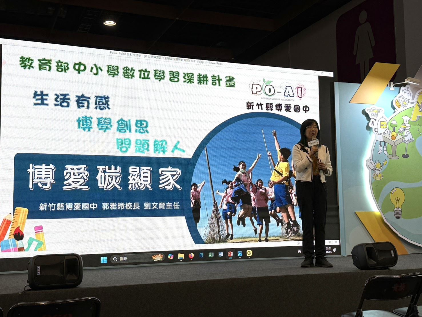 博愛國中校長郭雅玲表示,「低碳.永續~博愛碳顯家」系列課程,由劉文育主任與校內教師團隊攜手開發,聚焦氣候變遷議題,引導學生從日常生活出發,運用物聯網(IoT)感測器,監測校園與家庭的電力、水資源使用狀況,透過數據分析找出能源浪費的「黑洞」,設計出智能節能系統與智慧管理裝置,讓節能變得更聰明、更簡單!郭校長並指出,博愛教師團隊超過三十人共同投入課程研發與推廣,不僅於校內推展課程,也主動對外分享經驗,讓「素養不只在課堂裡被看見,更在真實生活中落地生根」。