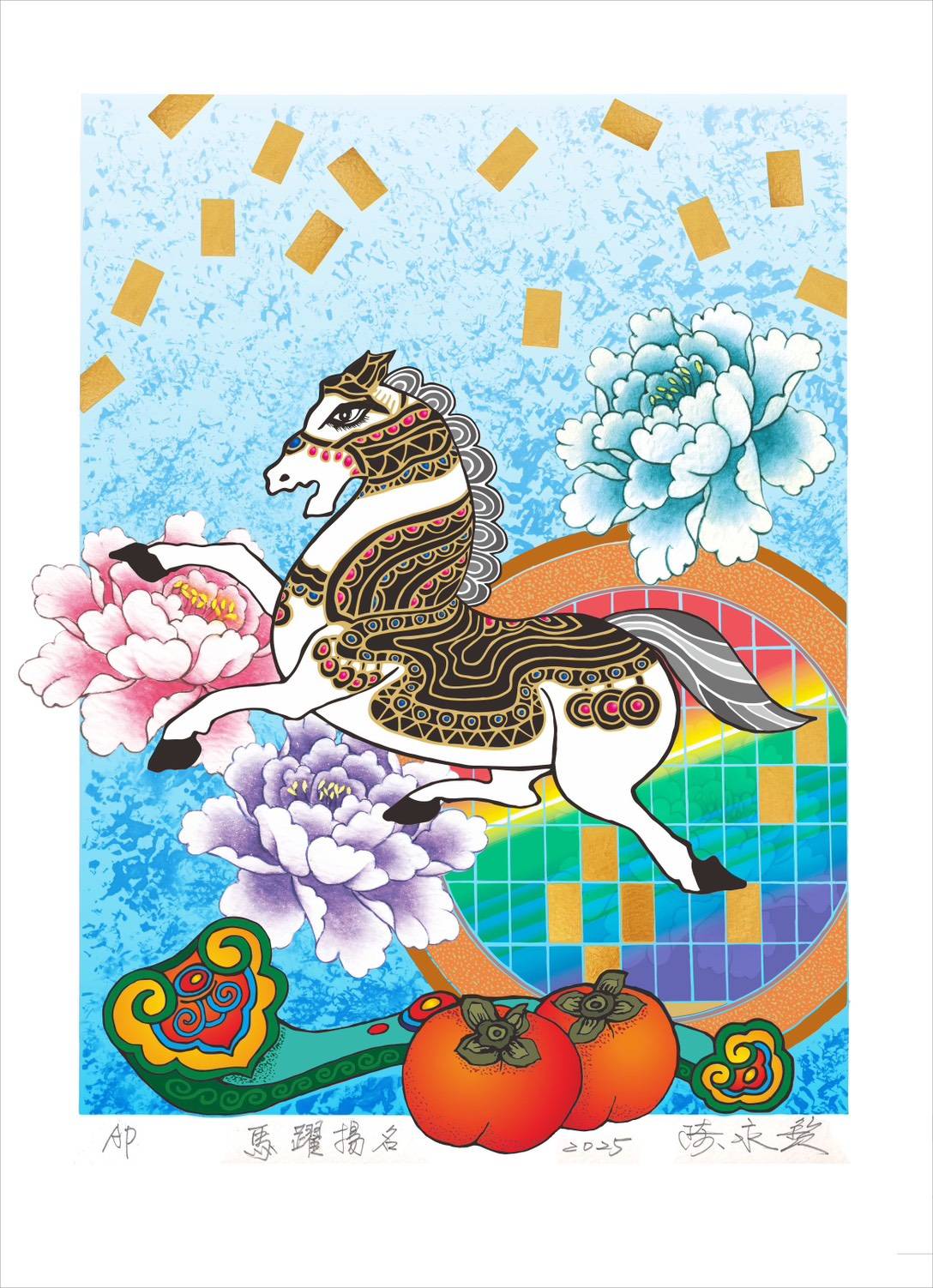 本次致贈的版印年畫《馬躍揚名畫》,以台灣作為全球晶片重鎮為創作核心,融合AI與晶圓產業意象,寓意台灣科技能量讓世界看見。畫中駿馬揚蹄象徵昂首向前與好運降臨,牡丹象徵富貴,柿子寓意事事如意。作品兼具時事脈動與吉祥寓意,不僅展現新竹文化藝術魅力,也強化竹縣文化跨海交流、深化台日友好合作的重要意義。