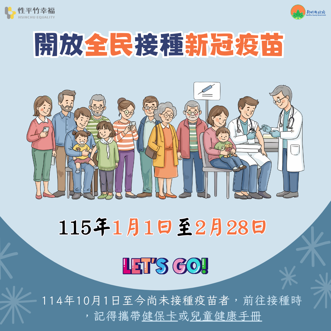近日冷氣團來襲,疾病傳播風險升高,為提升疫苗接種人口涵蓋率,發揮疫苗最大效益,自115(明)年1月1日起,新冠疫苗接種擴大為全民開打,只要6個月以上尚未接種的民眾都可免費接種。新竹縣政府衛生局提醒,公費施打新冠疫苗新增對象為從國小到49歲的民眾,日期到2月28日為止,請把握時間儘早接種,以提升免疫保護力,降低感染後併發重症及死亡風險。