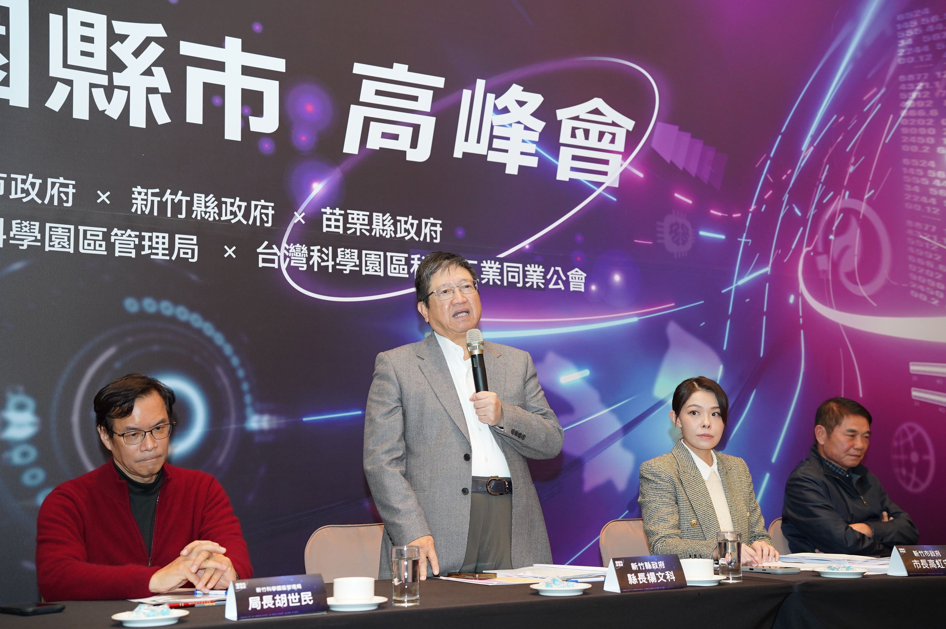 「園縣市高峰會」今(6日)於新竹市舉行第12次會議,由新竹市長高虹安主持,新竹縣長楊文科、苗栗縣長鍾東錦、新竹科學園區管理局長胡世民及台灣科學工業園區科學工業同業公會理事長李金恭共同出席。縣長楊文科於會中對於高市長歸隊表示欣喜,並強調此合作平台已成為連結中央與地方、解決治理難題的高效機制。