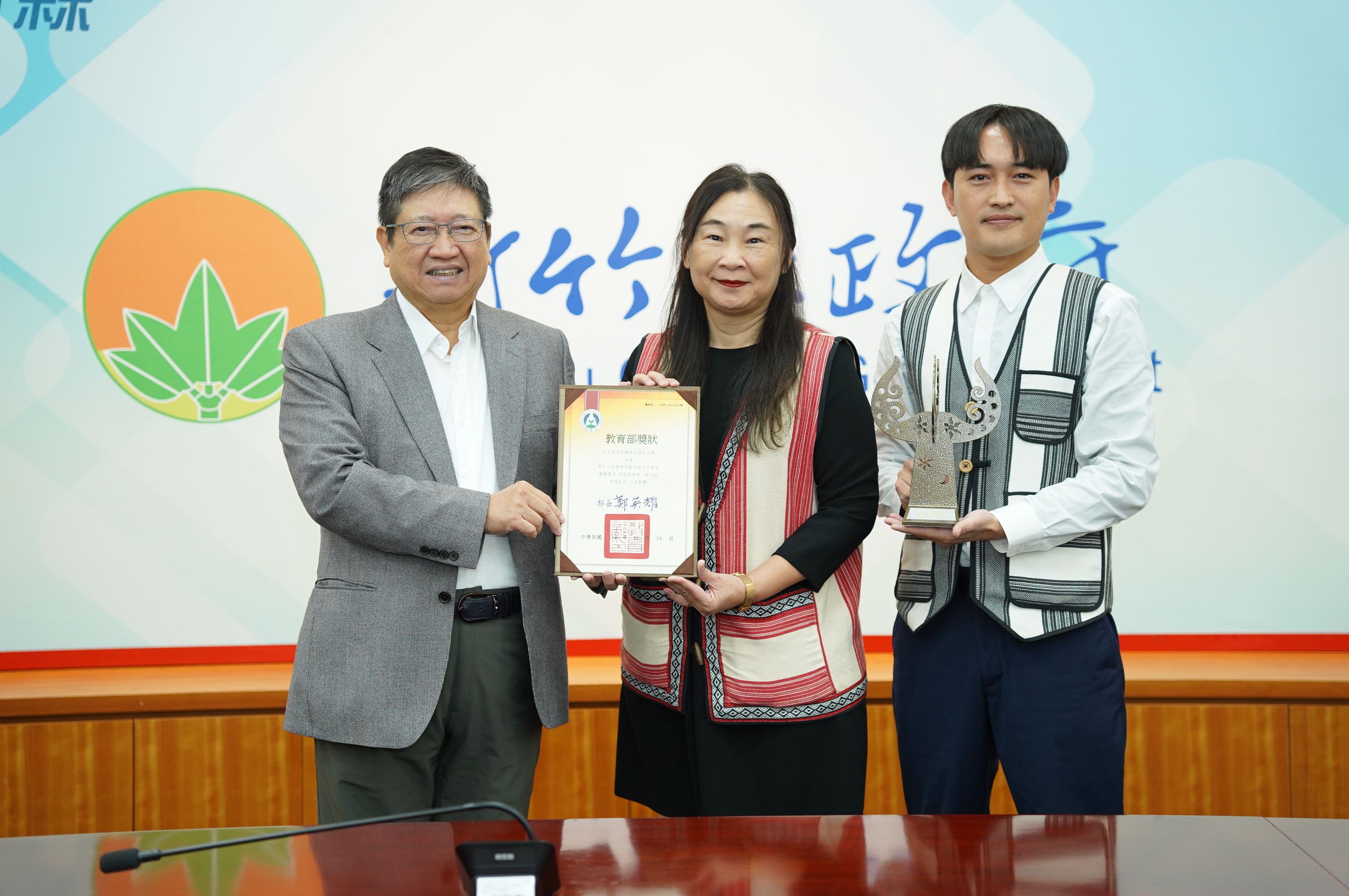 新竹縣尖石鄉新光國民小學結合社區與專業資源,為原鄉學童開啟多元創作視野,將創新與美感能量注入原鄉教育,讓藝術教育在山城扎根,形塑校園與部落共學共享的美感網絡, 獲教育部第12屆藝術教育貢獻獎「績優學校獎(國小組)」的肯定,校長錢偉慈日前(1月6日)在縣府主管會報中,特別將這份殊榮獻獎給楊文科縣長。
