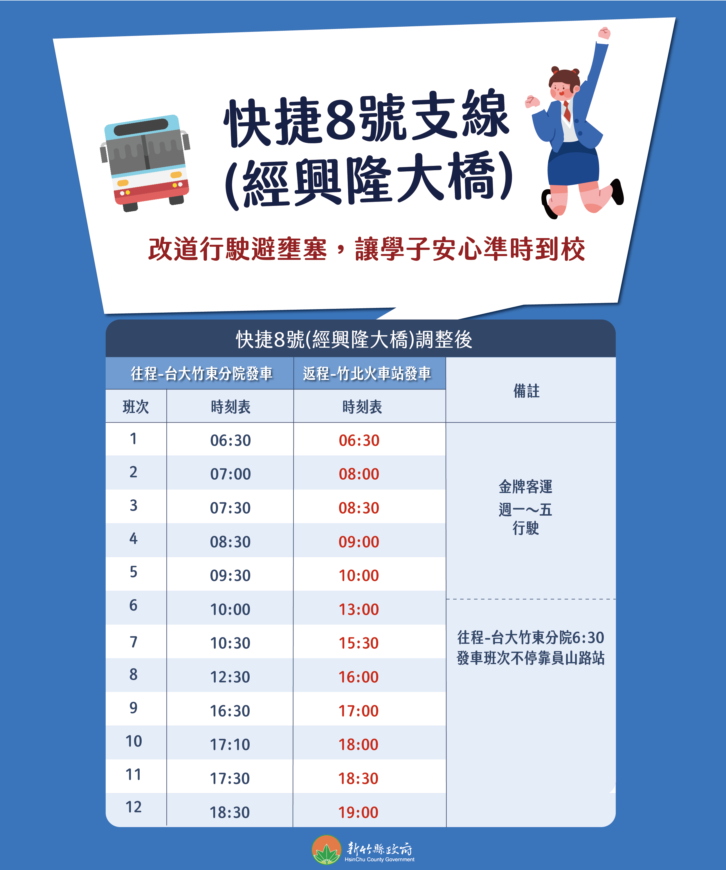 交通處提到,因現行上午尖峰時段興隆大橋常有壅塞情形,而且時常遇氣候不佳時,該路線上午6時30分發車班次抵達竹東高中時間約為7時55分,學生再步行至學校顯得較為倉促,希望經過這次調整,學生通學更加從容及安全。