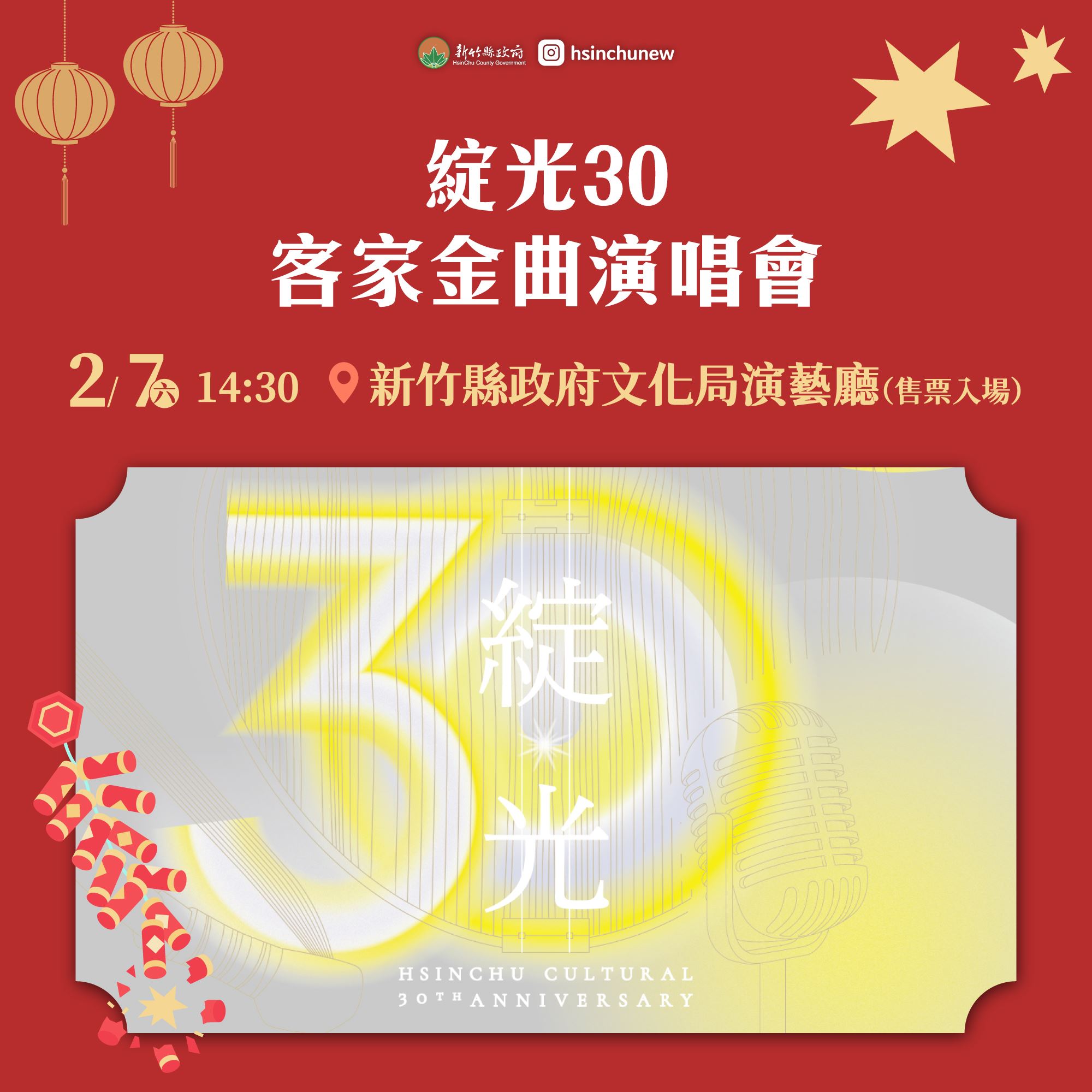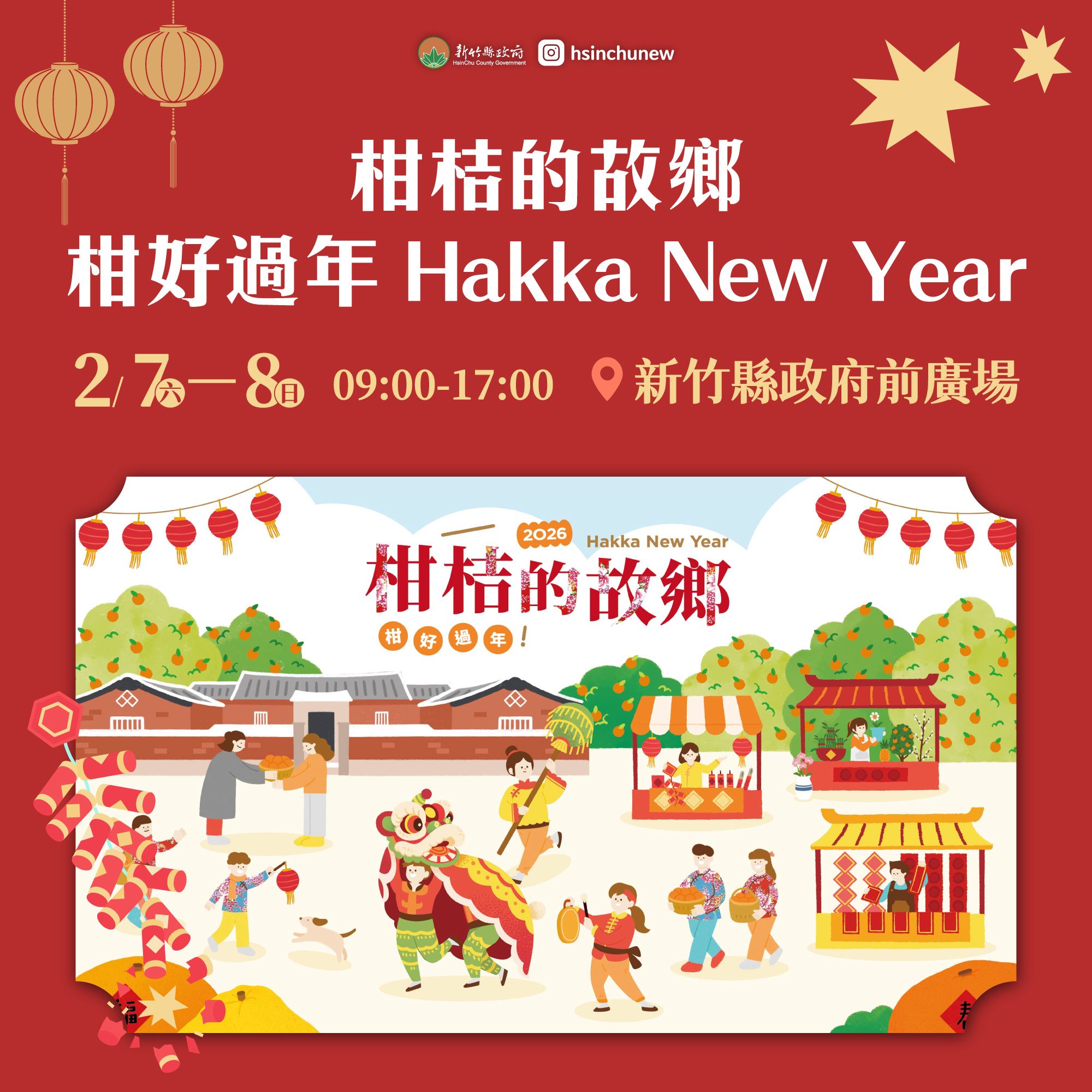 2月7日上午9時30分至11時30分,於新竹縣政府大廳舉辦「馬年新竹縣聯合春節揮毫」,邀請書法名家現場揮毫,將祝福寫進新的一年;2月7、8日於縣府前廣場舉辦「柑桔的故鄉—柑好過年 Hakka New Year」,透過市集、展演與互動活動,展現客家年節特色。當日下午並於文化局演藝廳推出「綻光30—客家金曲演唱會」,即日起開放售票,以動人歌聲陪伴民眾迎新年。