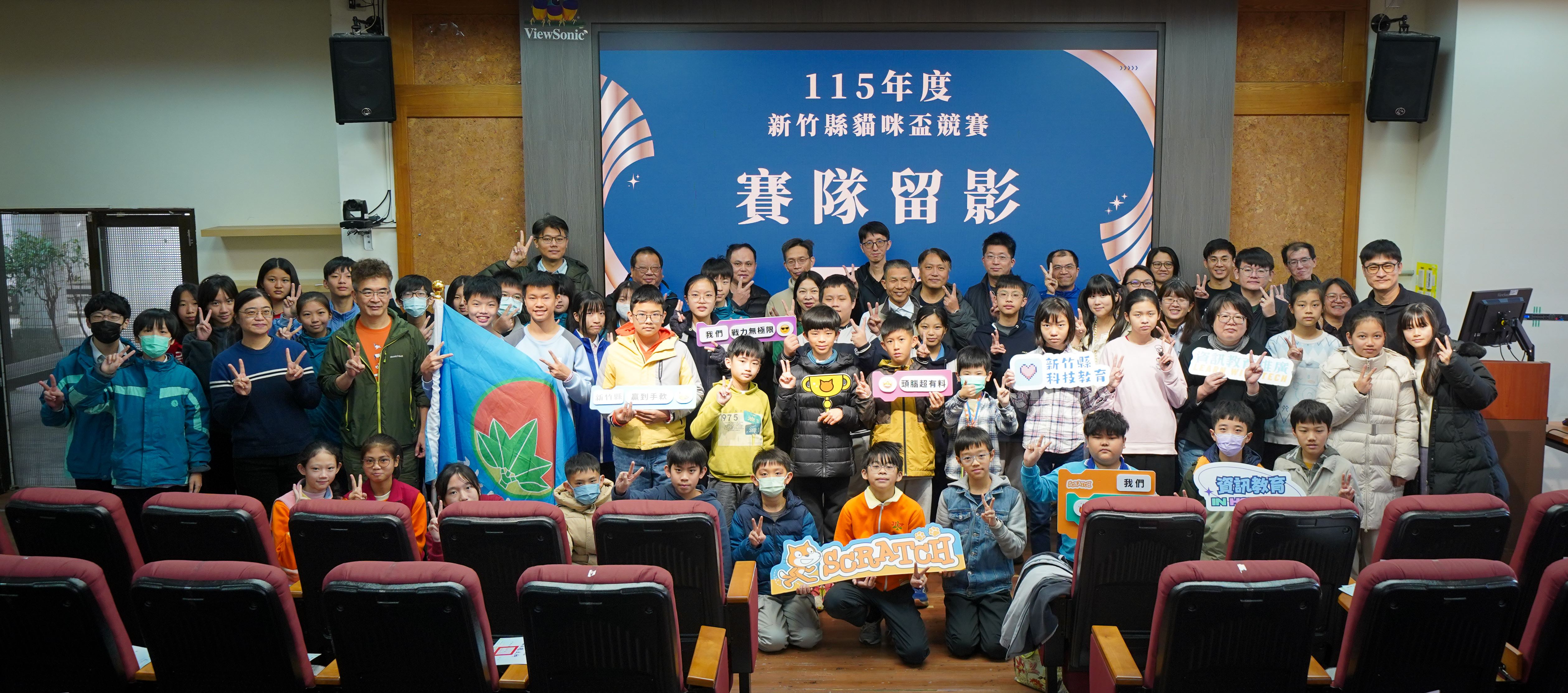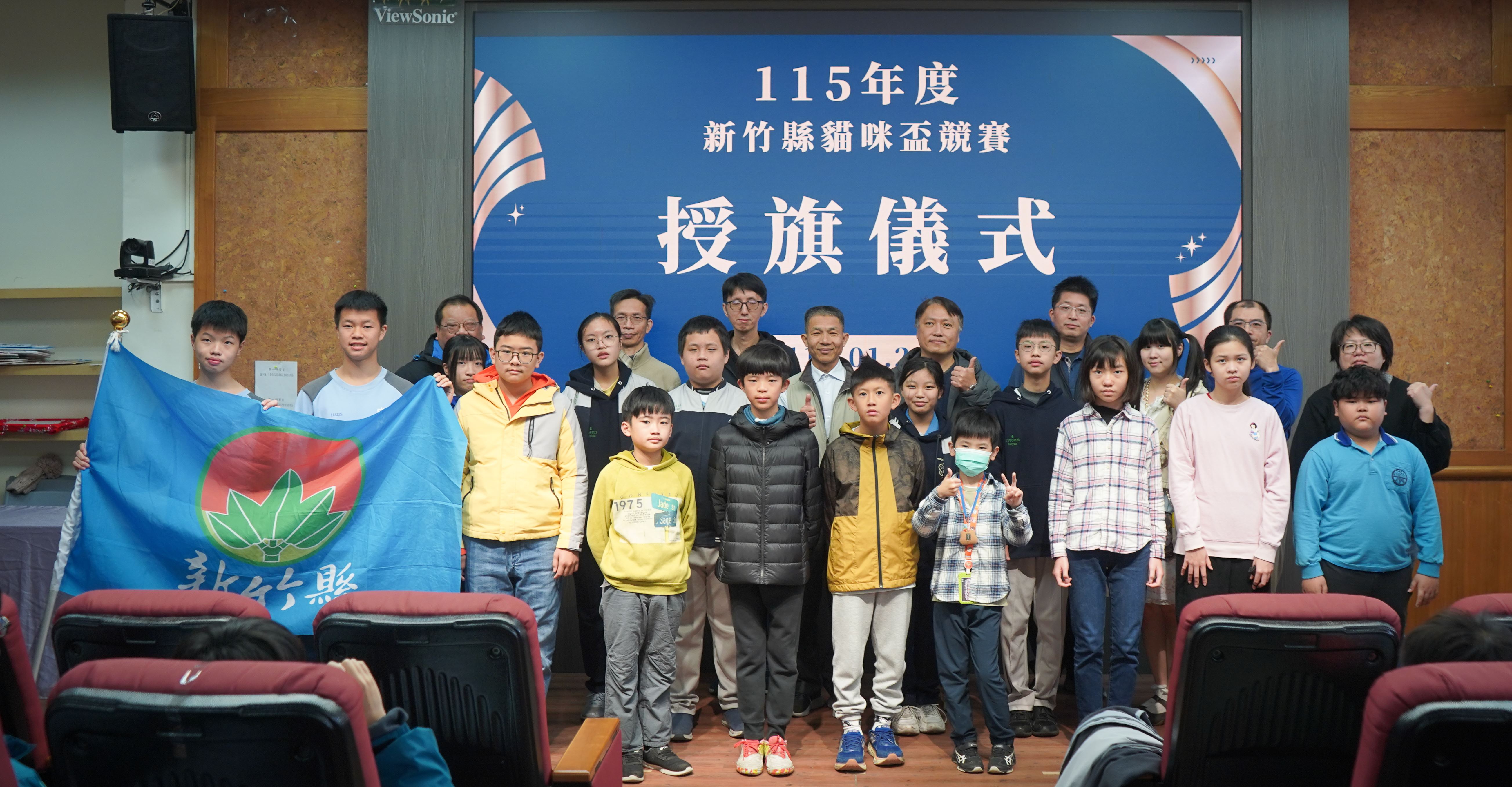 為深耕資訊教育並培養學生運算思維能力,新竹縣政府教育局今(23日)於教網中心舉行「115年度新竹縣貓咪盃競賽」頒獎典禮暨全國賽授旗儀式。由新竹縣政府教育局副局長林益洲代表出席,表揚縣賽中脫穎而出的優秀學子及授旗勉勵8支特優隊伍,預祝孩子們代表新竹縣在4月全國大賽中再創佳績。