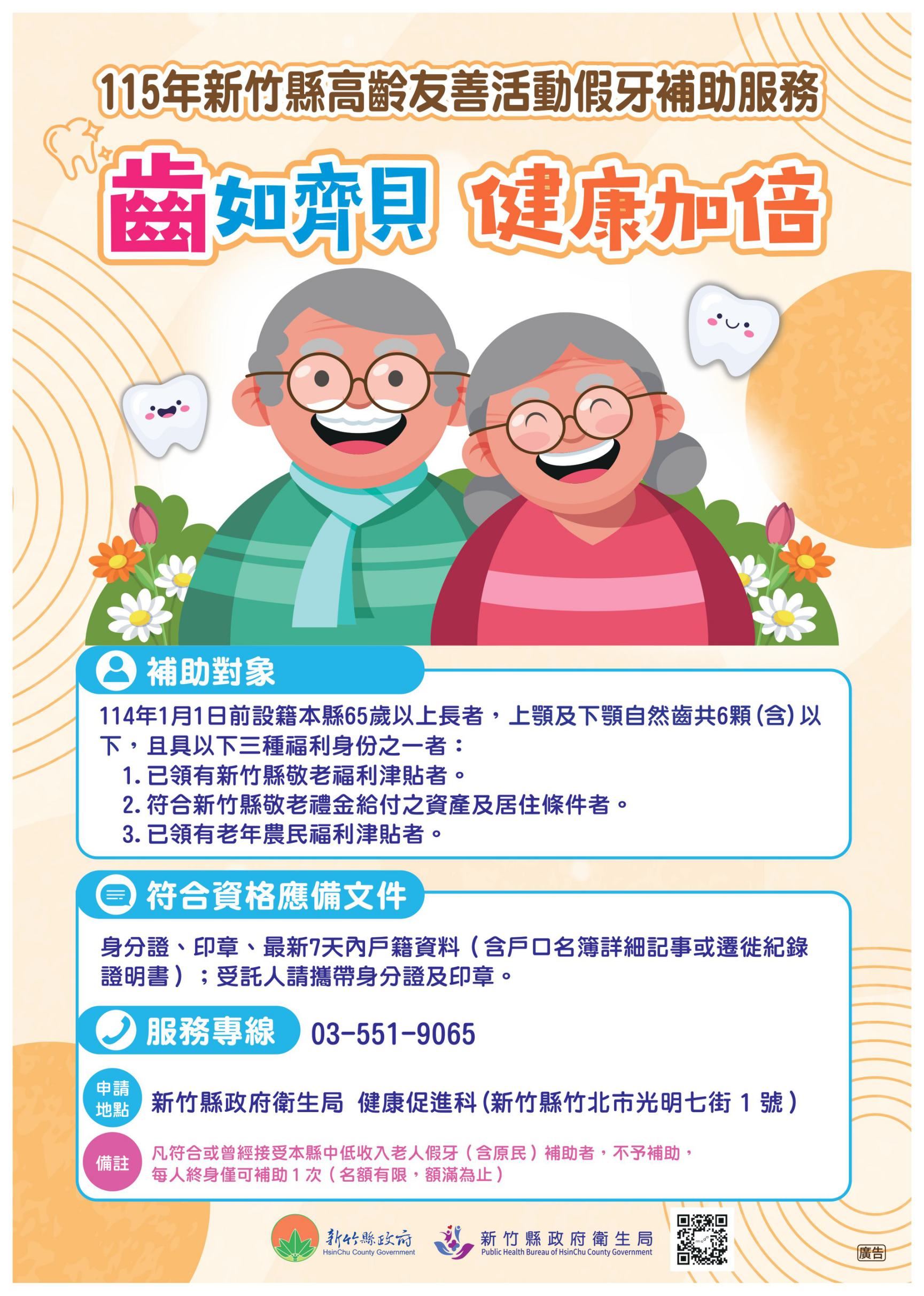 新竹縣政府衛生局於115年推動「高齡友善長者裝置活動假牙補助實施計畫」,協助缺牙長者重建口腔功能、改善營養攝取,並減輕長者及家庭的經濟負擔。補助內容包含口腔篩檢、口腔檢查評估及全口活動假牙裝置等服務,符合資格者最高可獲6萬元假牙補助,期望讓更多長者能安心享受進食與生活品質。