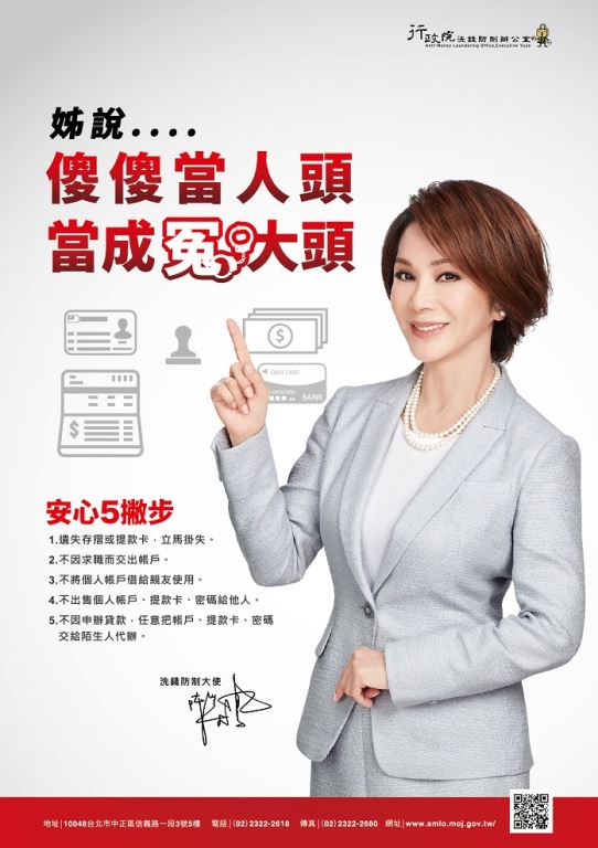 為了提高國人防制洗錢的意識,有效遏止不法洗錢活動之發生,行政院洗錢防制辦公室特別製作下列3款電子海報: 1.傻傻當人頭當成冤大頭。 2.客戶詳審查金流有保固。 3.冒險當車手錢入他人手-當了車手就有罪,他人賺飽卻脫罪。