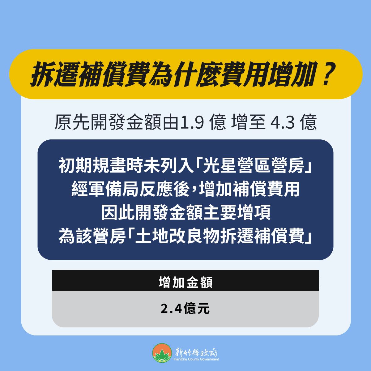 縣府說明,本重劃案的開發費用由原先約新臺幣 1億9,200萬餘元,修正增加至約 4億3,400萬餘元,主要增項為「土地改良物拆遷補償費」,增列金額約2億多元 。