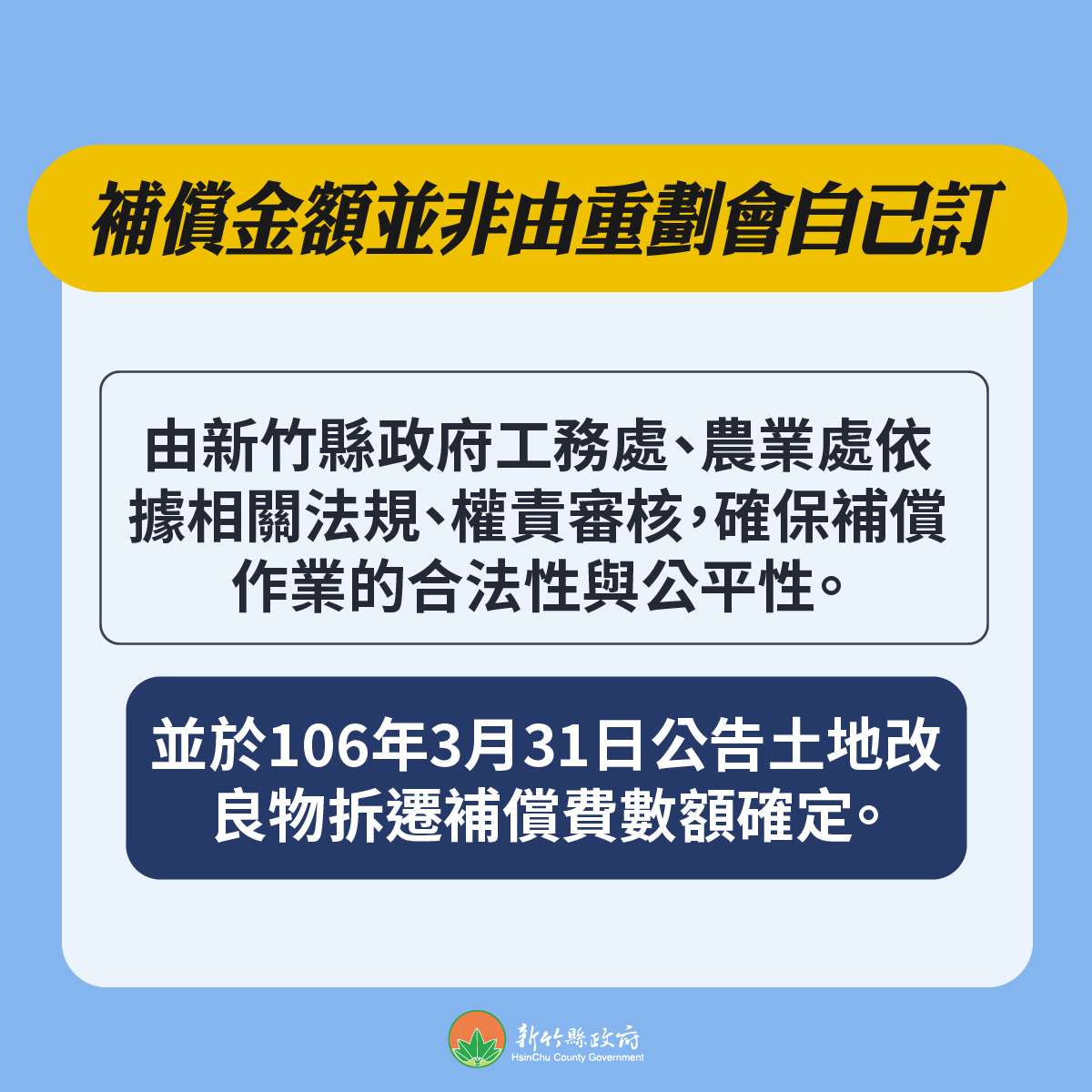 相關補償基準並非由重劃會自行認定,而是由縣府工務處及農業處依據相關法規、權責審核,確保補償作業的合法性與公平性。並於106年3月31日公告土地改良物拆遷補償費數額確定,國防部軍備局工程營產中心中部地區工程營產處於106年3月14日函請重劃會提存,並於同年6月6日進行土地改良物拆遷補償費提存、107年6月20日進行自拆獎勵金提存。