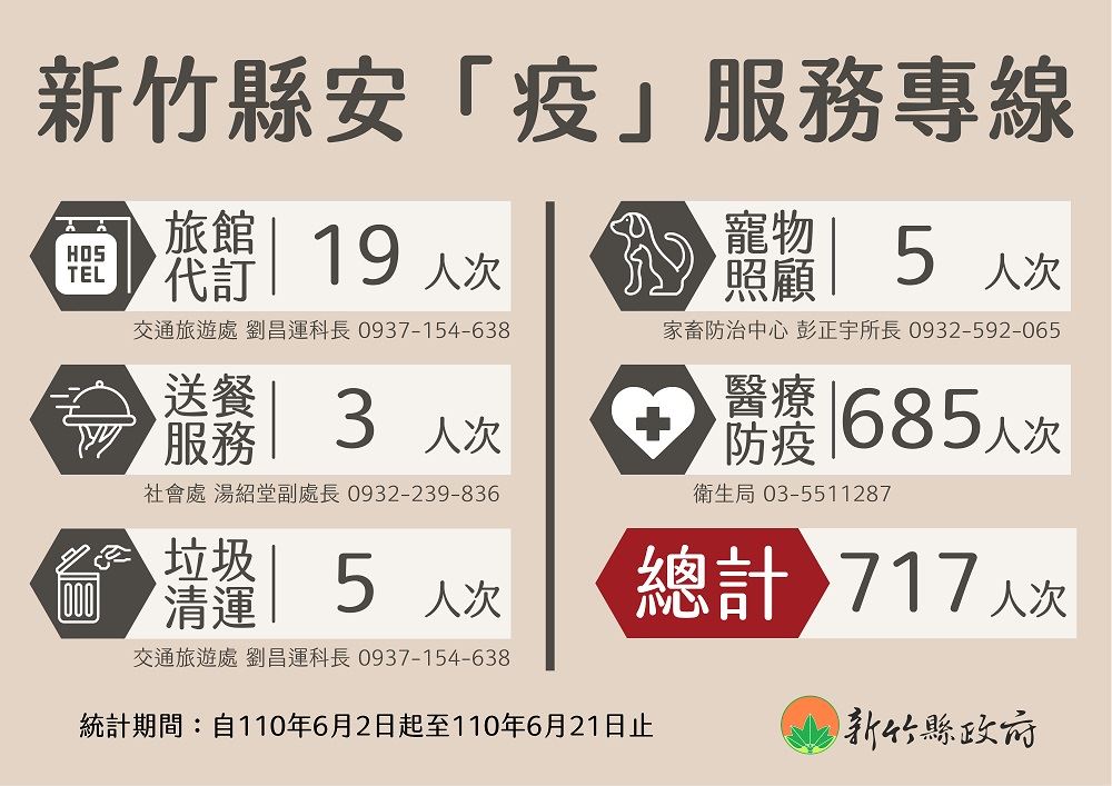 防疫統計方面,本縣累計的居家隔離人數為1599人,目前已解除隔離有1419人,目前尚在居家隔離者有180人。縣府6月2日成立4支「安疫專線」,提供專人24小時服務居家隔離者,到6月21日止,已完成717人次的服務。本縣居家檢疫累計人數有1萬4519人,目前尚在居家檢疫人數有193人。防疫旅館的部分,目前使用71間,尚有177間空房可運用。