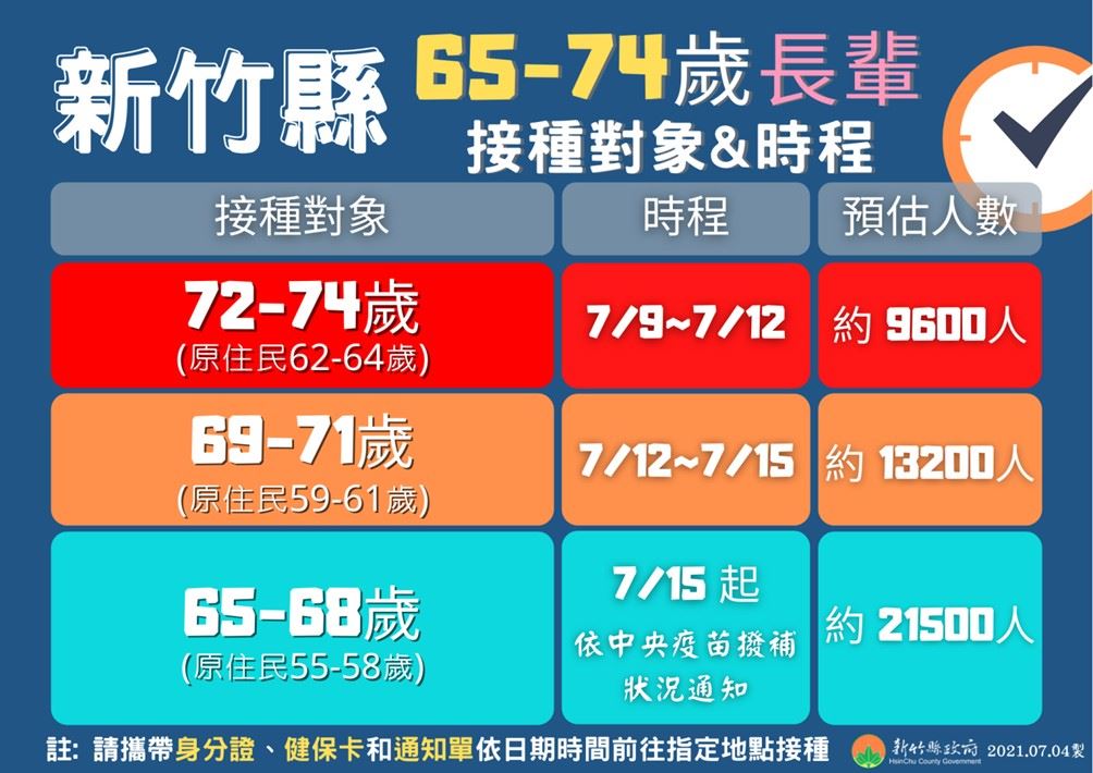 新竹縣長楊文科指出,新竹縣規劃72至74歲(原住民62至64歲)長者於7月9日至12日施打疫苗,69至71歲(原住民59至61歲)長者從7月12日至15日施打,65至68歲(原住民55至58歲)長者原則上從7月15日起開打,仍將視中央實際配發疫苗到貨數量調整。