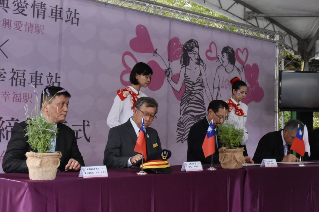 Magistrate Chiu said that he hopes the agreement can promote the cultures and increase relationship. He presented Mayor Yonezawa Norihisa with the Love sculpture made by master sculptor Lin Jian-cheng, the work symbolizing the enduring friendship of Taiwan-Japan. Yonezawa Norihisa said that like Kofuku Happiness Station, Hexing Station’s love story can give people hopes and happiness. He hopes that the twinning between two stations will promote Taiwan-Japan’s friendship and exchange.