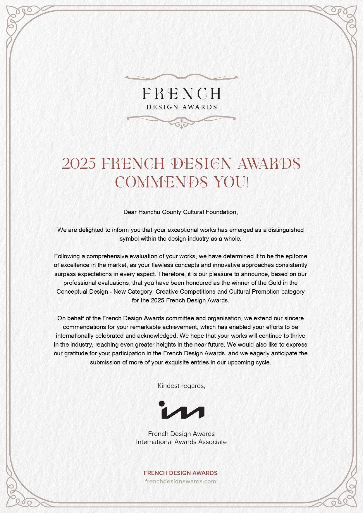 The Taiwan Creative Craft Design Contest: Dream of Craft organized by the Hsinchu County Cultural Foundation was an entrant in the 2025 French Design Awards Season 2. The Taiwan Creative Craft Design Contest contended with more than 3000 entries from 38 countries to rise above them all, becoming the only global winner of a Gold award in the Creative Competitions and Cultural Promotion category. Hsinchu County Cultural Foundation Director and Hsinchu County Magistrate Yang Wen-ke was delighted that, in the three years since the Foundation was restarted, it has already delivered such sparkling results. This has propelled Hsinchu County’s energy for bringing together traditional craft arts and innovative design onto the global stage; and it symbolizes how Hsinchu County’s cultural governance strategy and real-world results are winning worldwide affirmation.